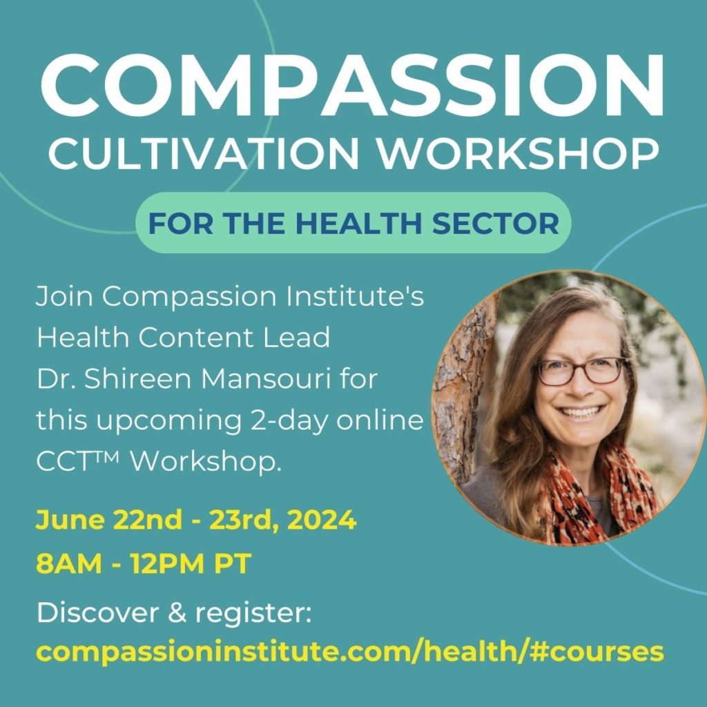 Health professionals, you’re invited to join Shireen Mansouri, M.D. for her online Compassion Cultivation Training (CCT™) Workshop for the Health Sector — taking place June 22 and 23, 2024.